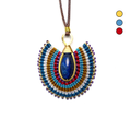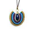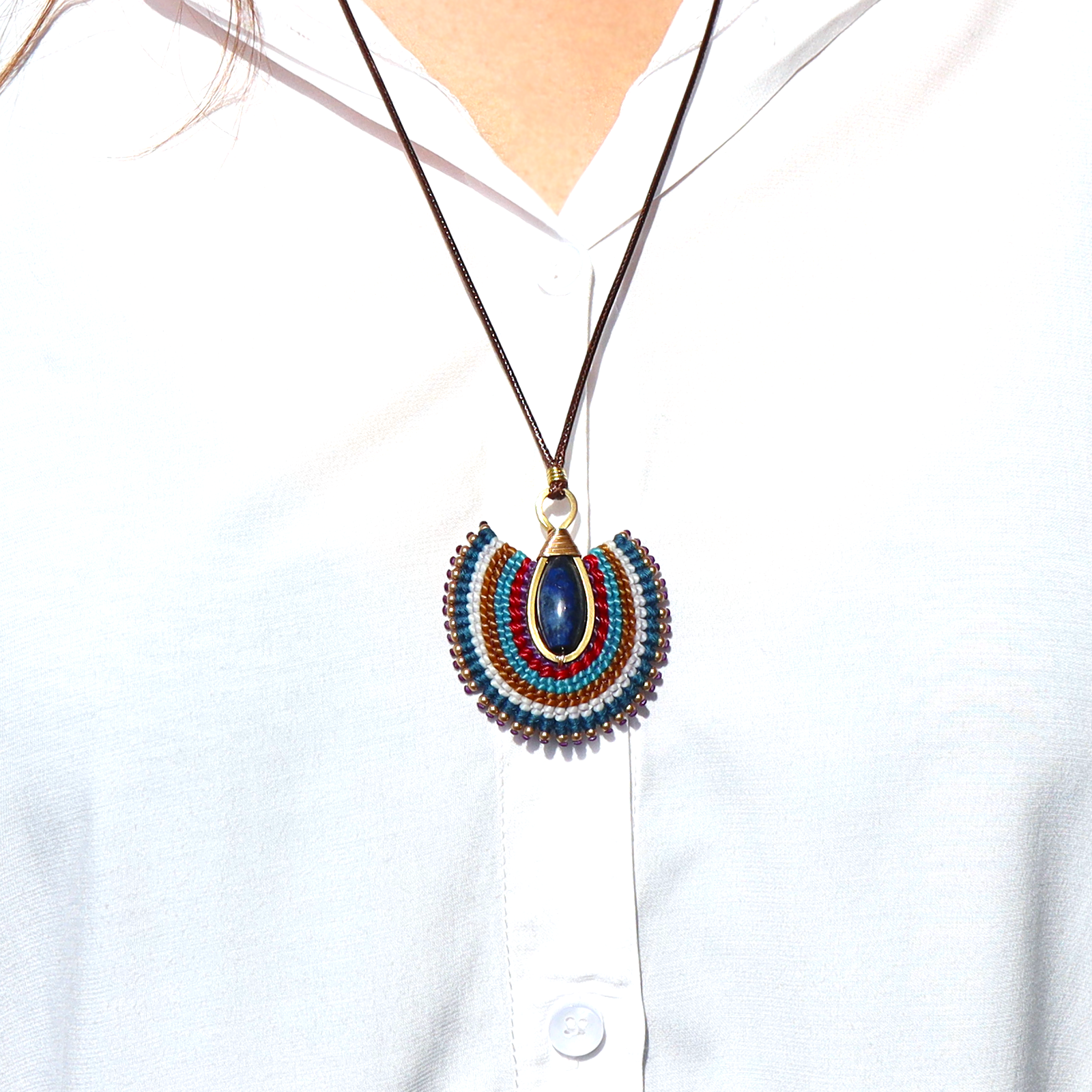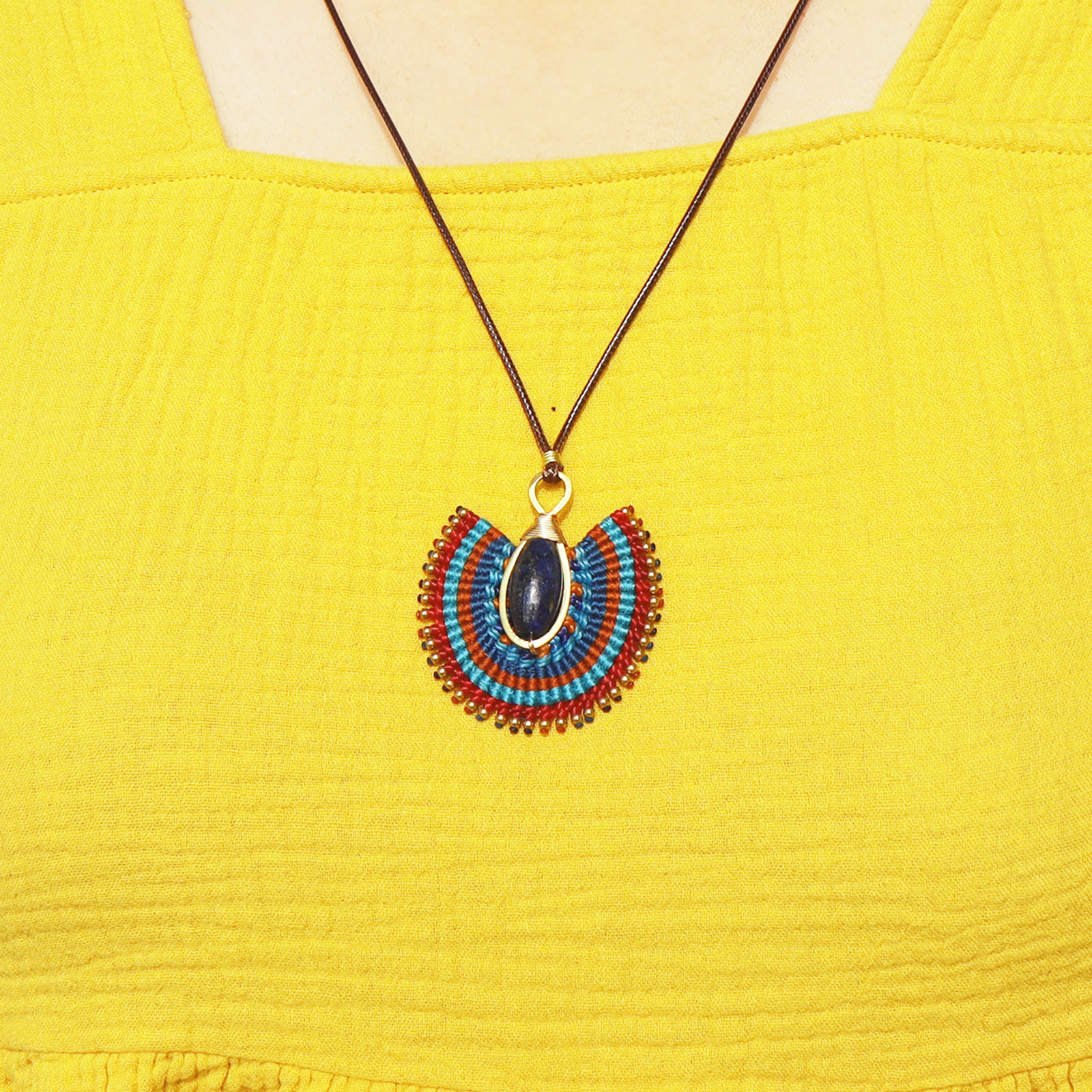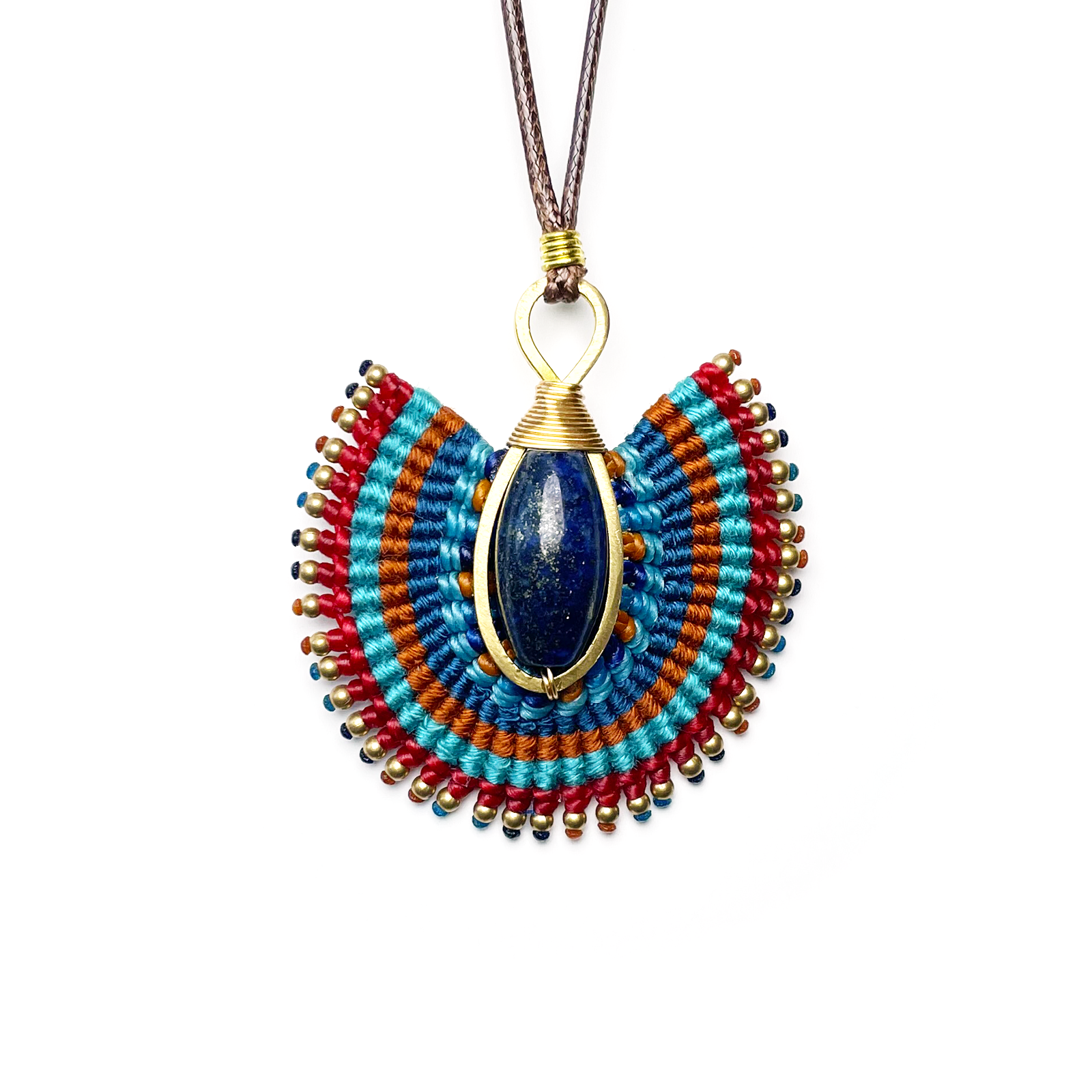 Each piece is lovingly handcrafted with colorful waxed cord, accented with tiny brass beads that catch the light with every movement. The elegant fan shape and striking lapis center create a look that's both earthy and bold — perfect for everyday wear or as a unique gift.