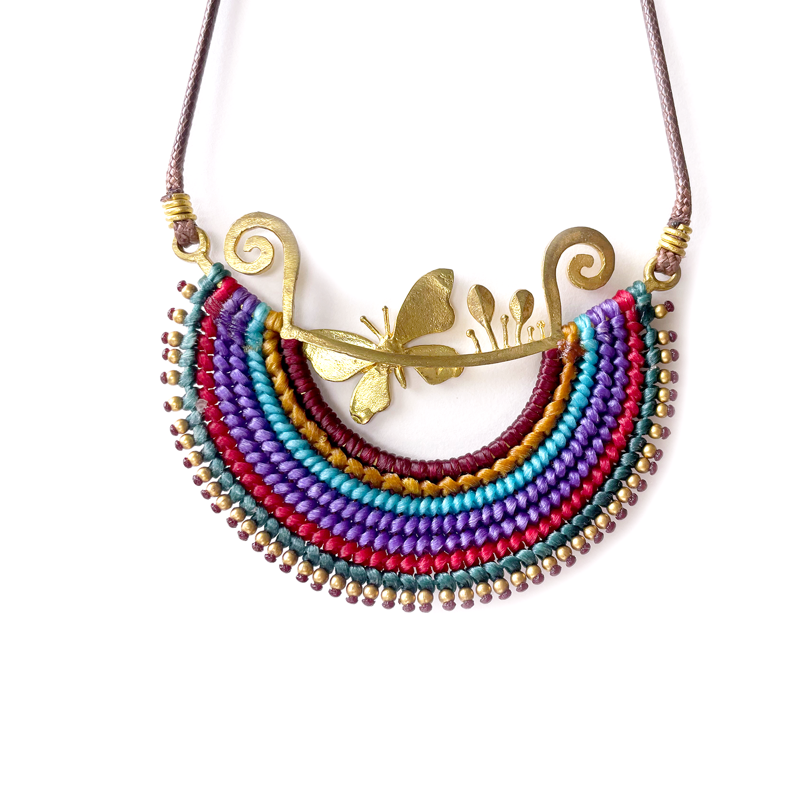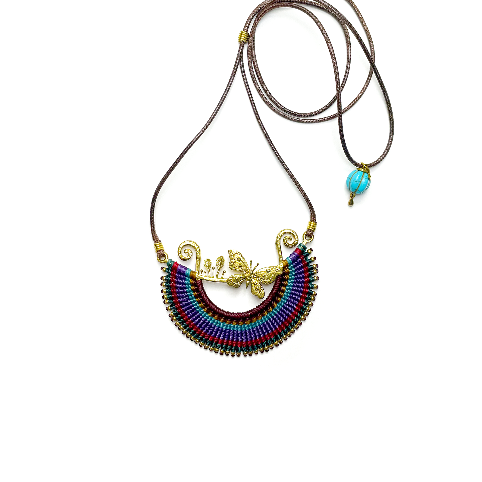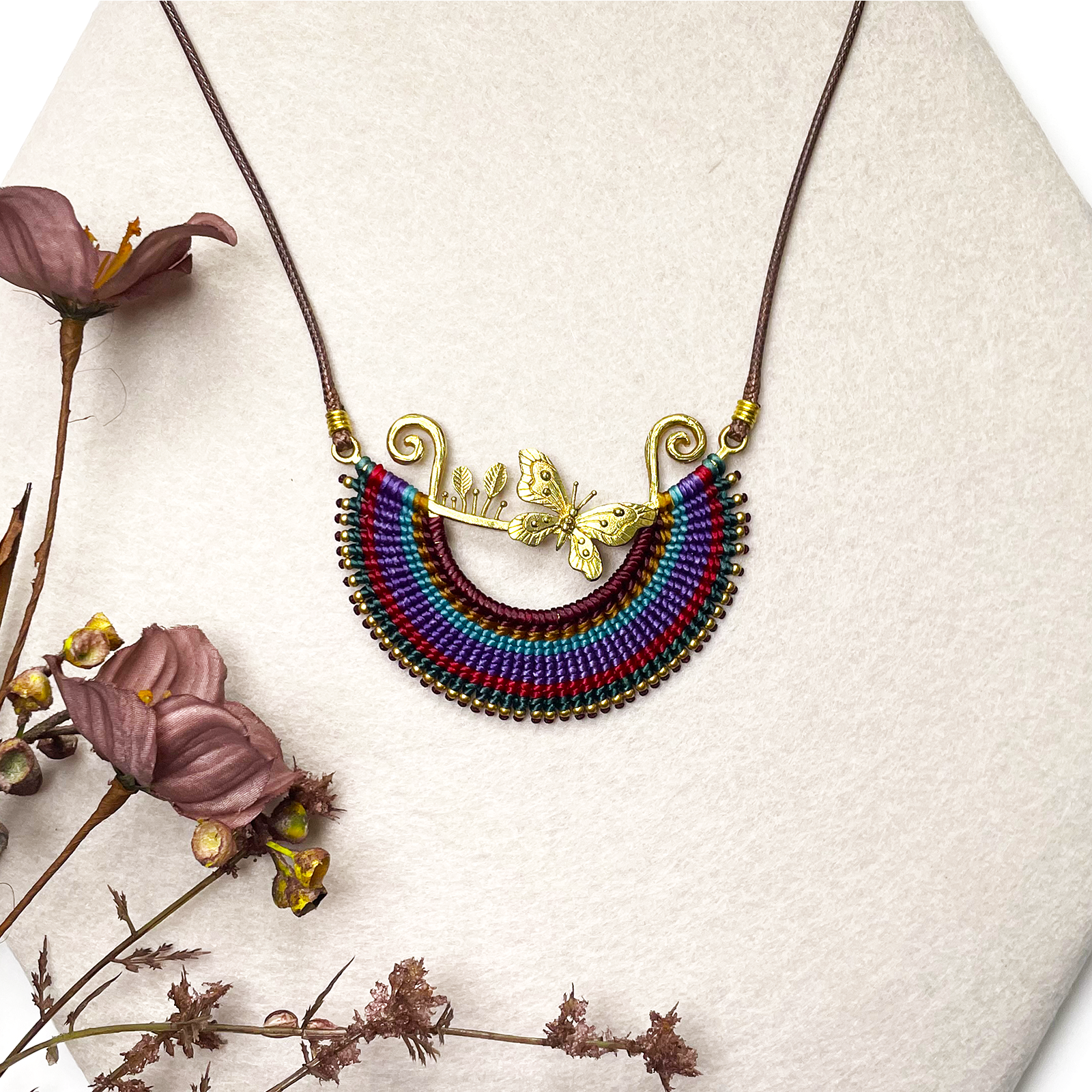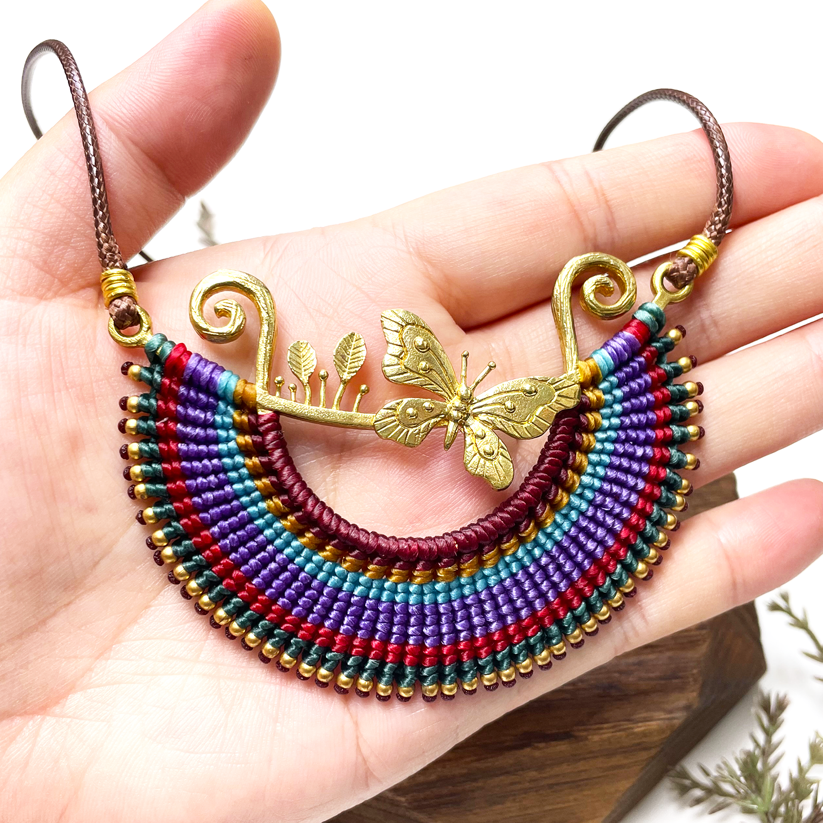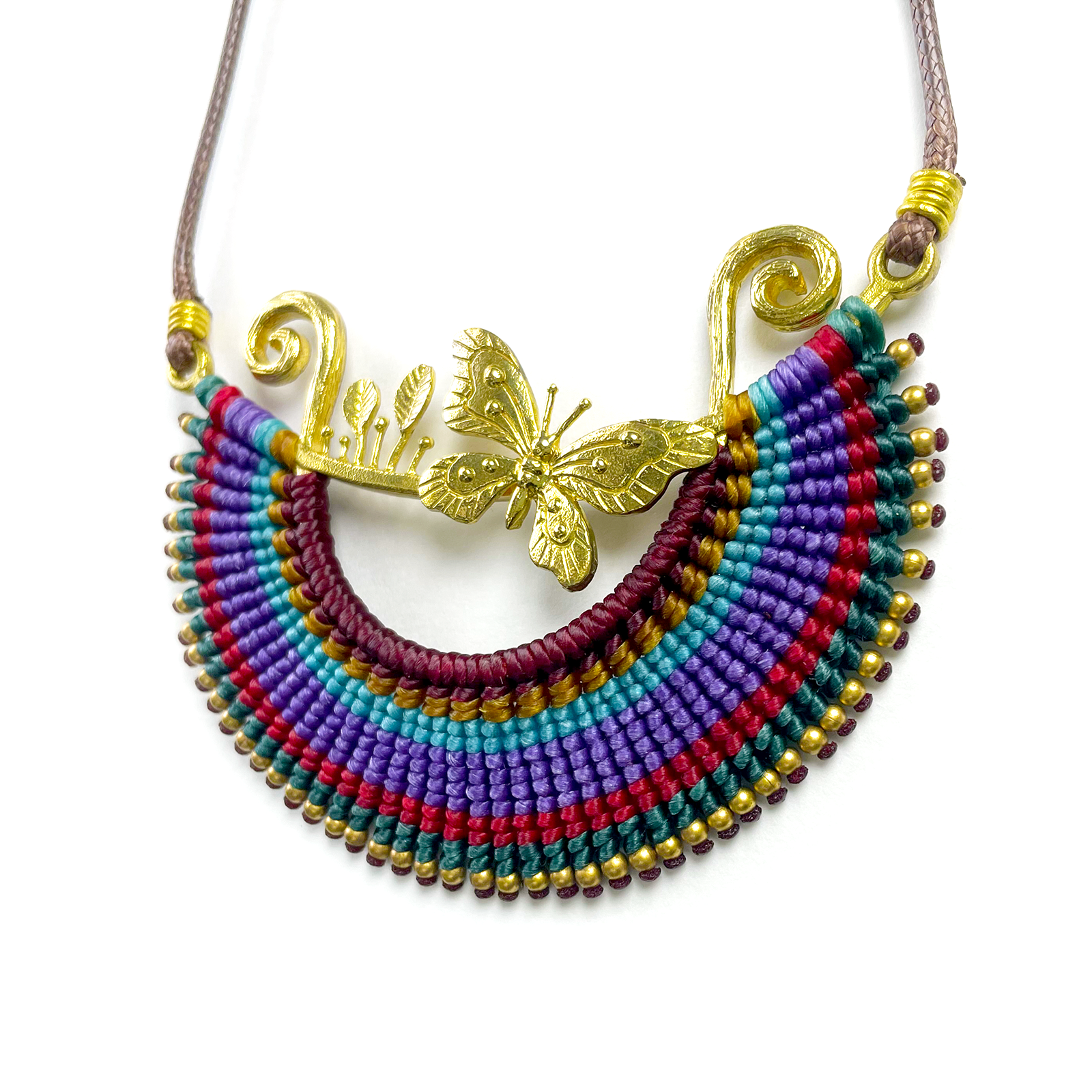 Celebrate transformation, freedom, and artistry with this handcrafted Butterfly Macramé Necklace. At the heart of this vibrant piece is a custom-made brass butterfly, resting gently above layers of richly colored hand-knotted macramé. The graceful curves and radiant colors create a statement that’s both bold and poetic.