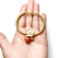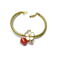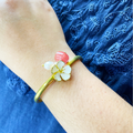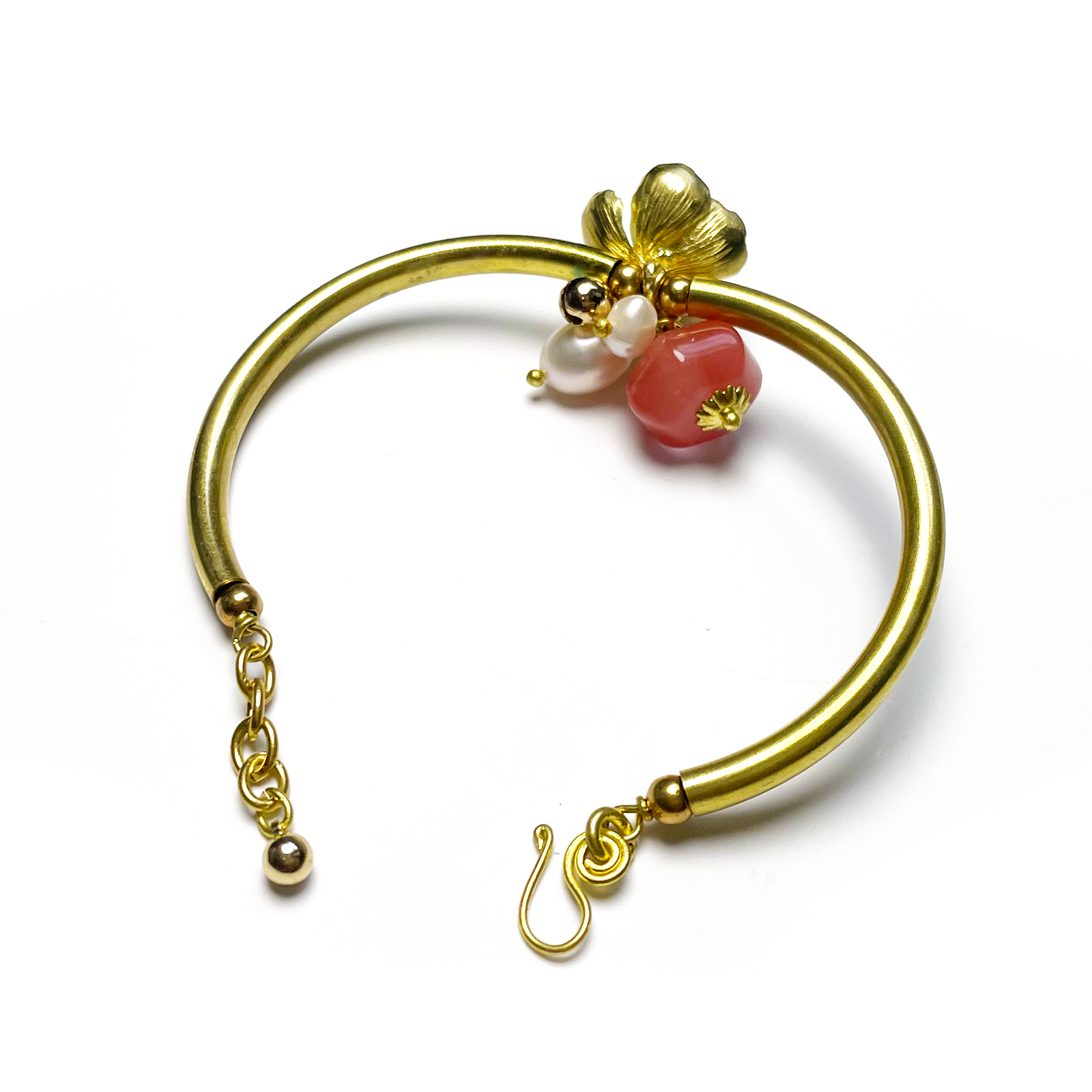 Delicate and radiant, this handcrafted bangle brings a graceful touch to any outfit. Featuring a charming enameled white flower centerpiece, accented by a dyed pink jade and a couple of freshwater pearl beads, this piece captures the beauty of spring at every glance.