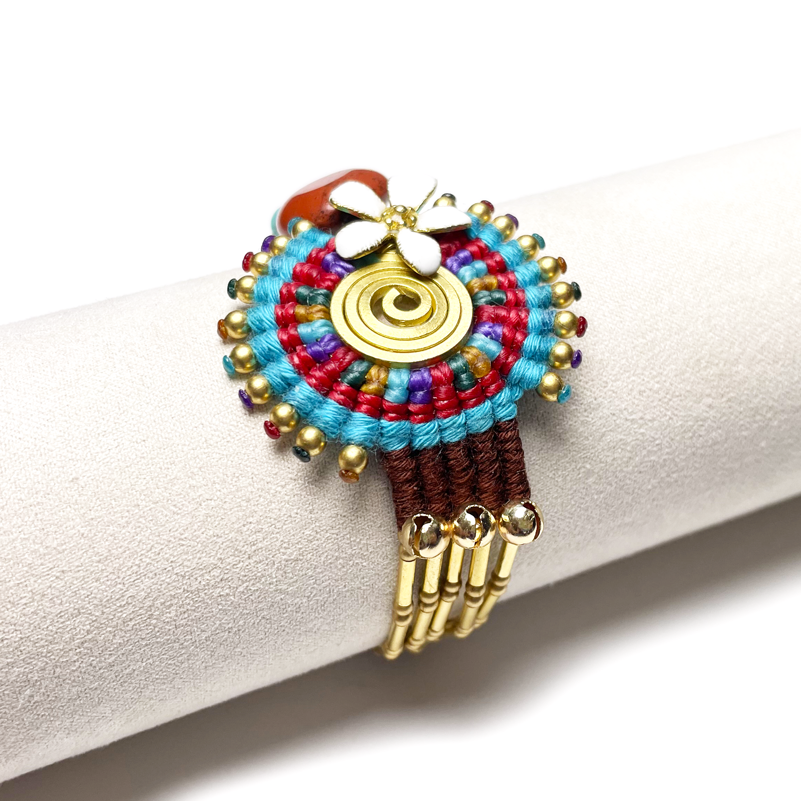 Add a burst of artisan charm to your collection with this vibrant daisy handmade macramé bracelet, thoughtfully woven with rich, earthy tones and natural stones.
