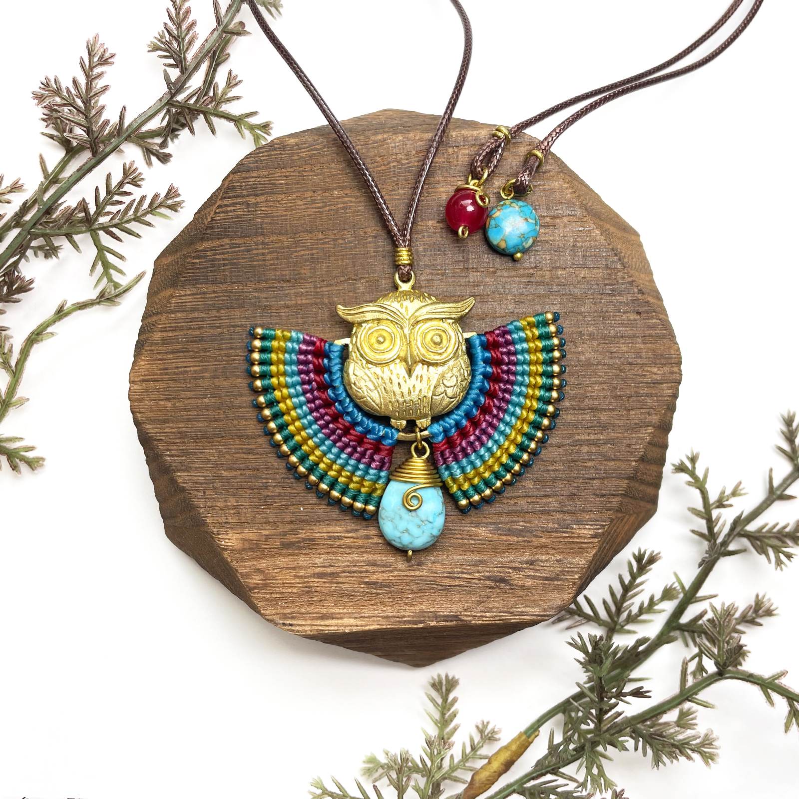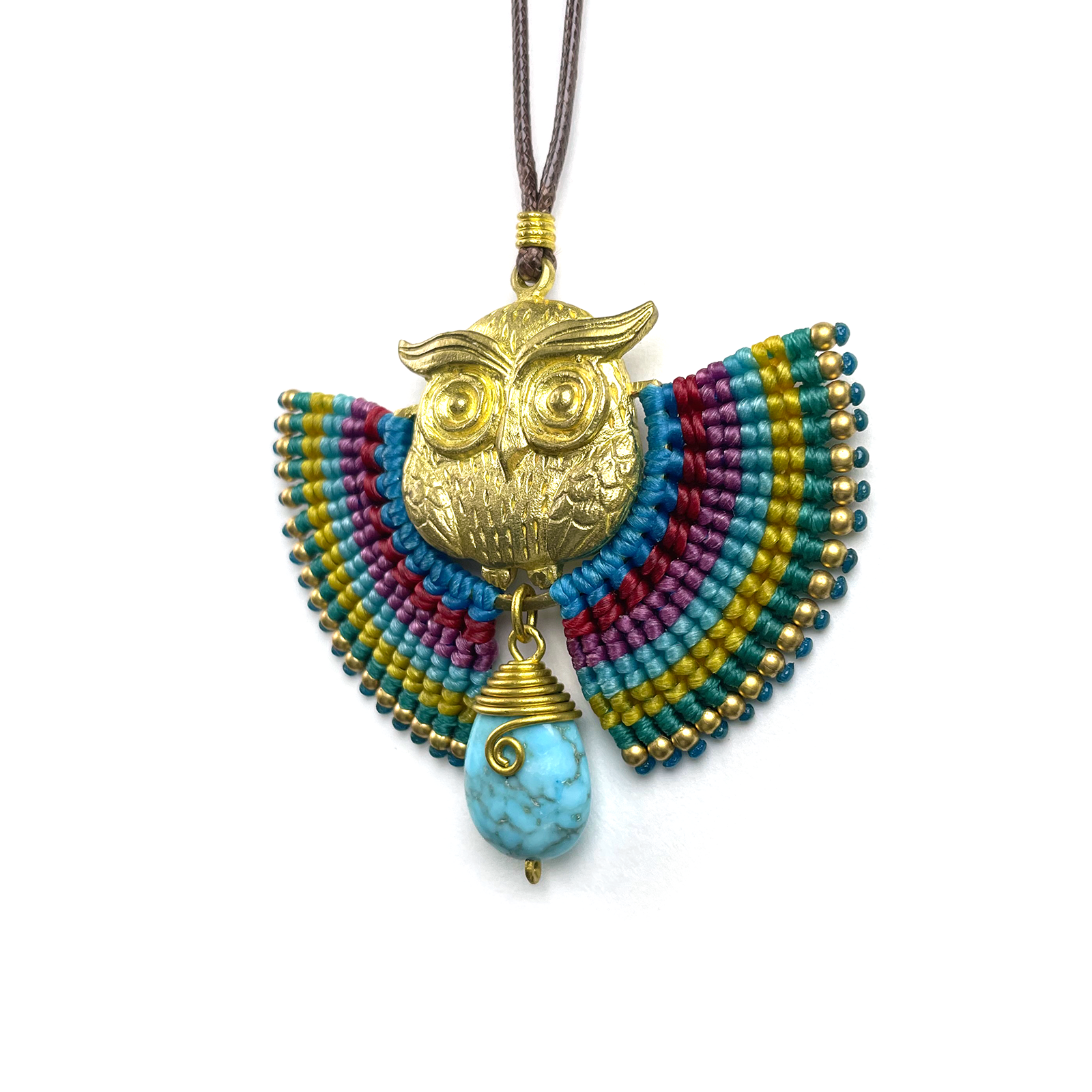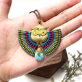 Add a touch of wisdom and whimsy to your look with our Handmade Owl Pendant Necklace, beautifully crafted with intricate macramé wings in vibrant bohemian colors. The centerpiece features a striking brass owl charm, symbolizing intuition and insight, paired with a genuine turquoise stone drop—known for its calming and protective energy.